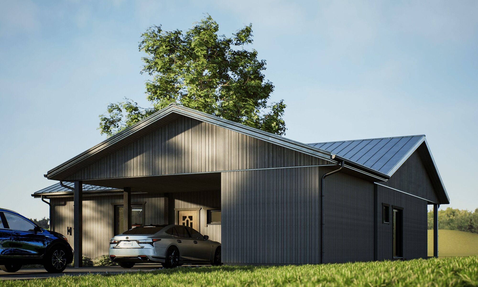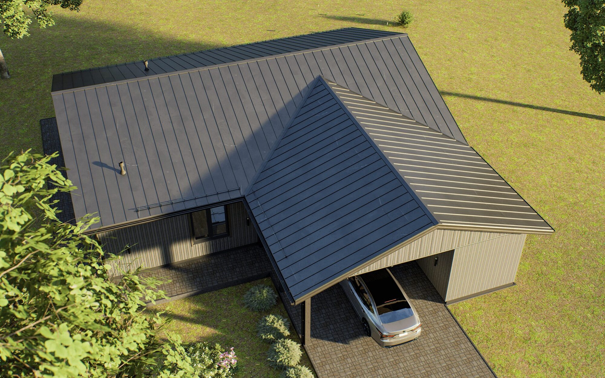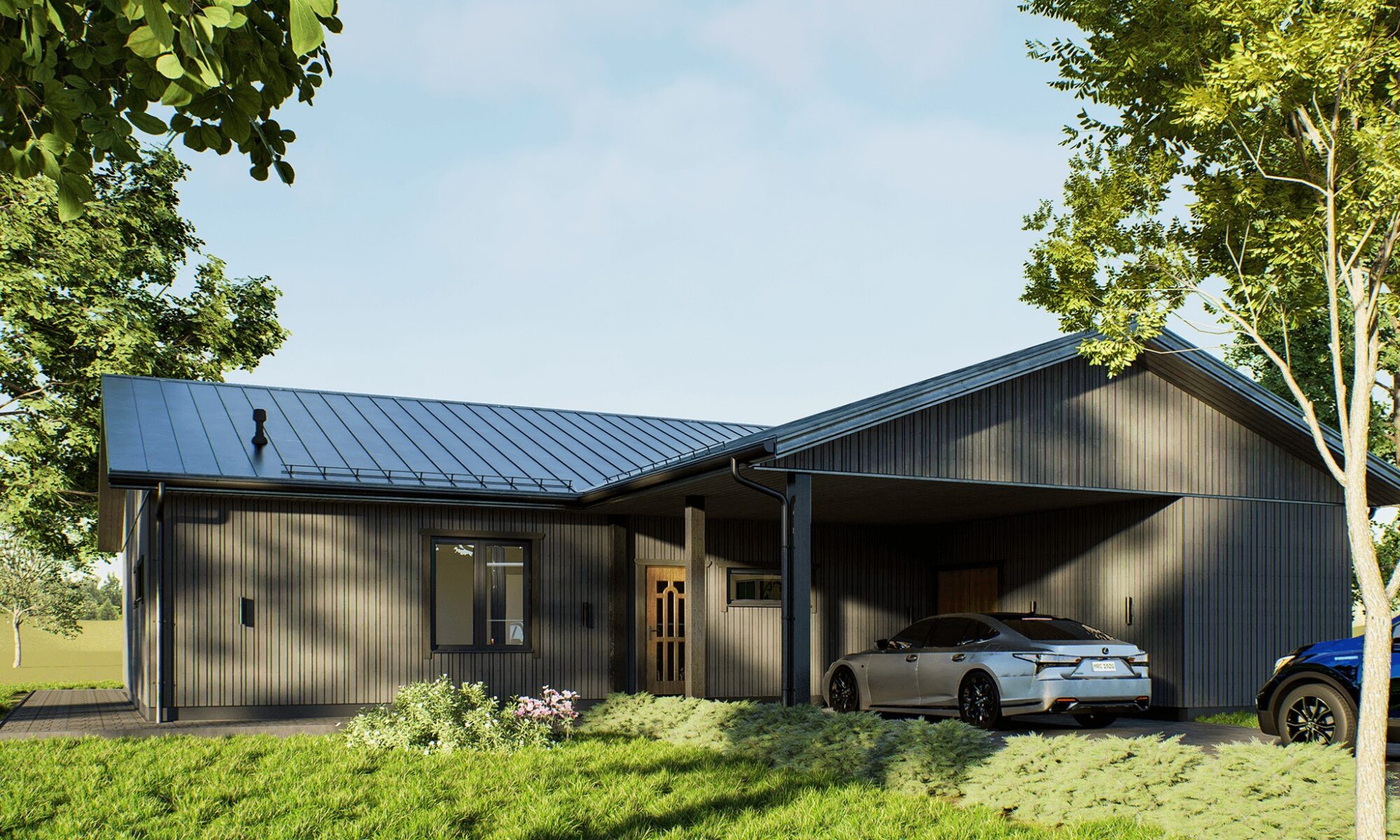 L-kujuline maja koos autovarjualuse ja välilao/kuuriga, kuhu mahub nii aiatööriistu kui ka jalgrattaid.