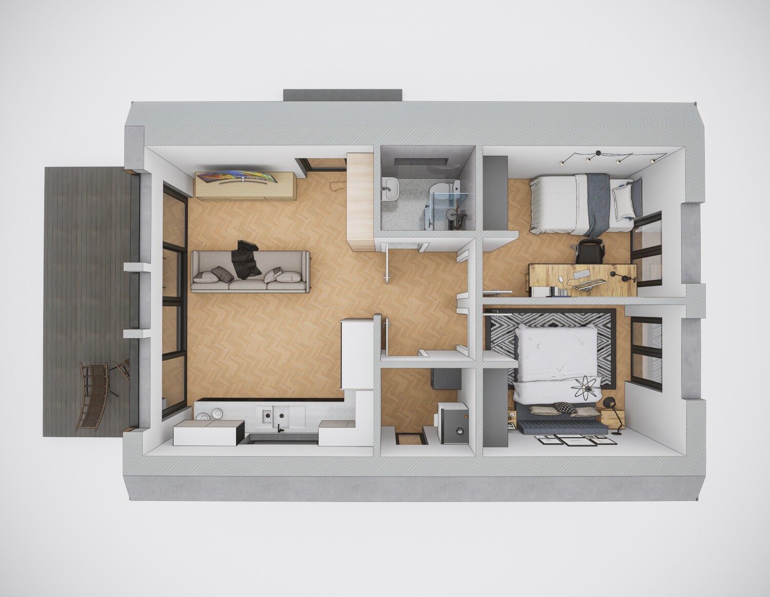 Elutoa osa on kõrgete lagedega, kuid tubade kohal on avatud tüüpi mansardkorrus (loft), mida saab kasutada lisamagamiskohtadena.